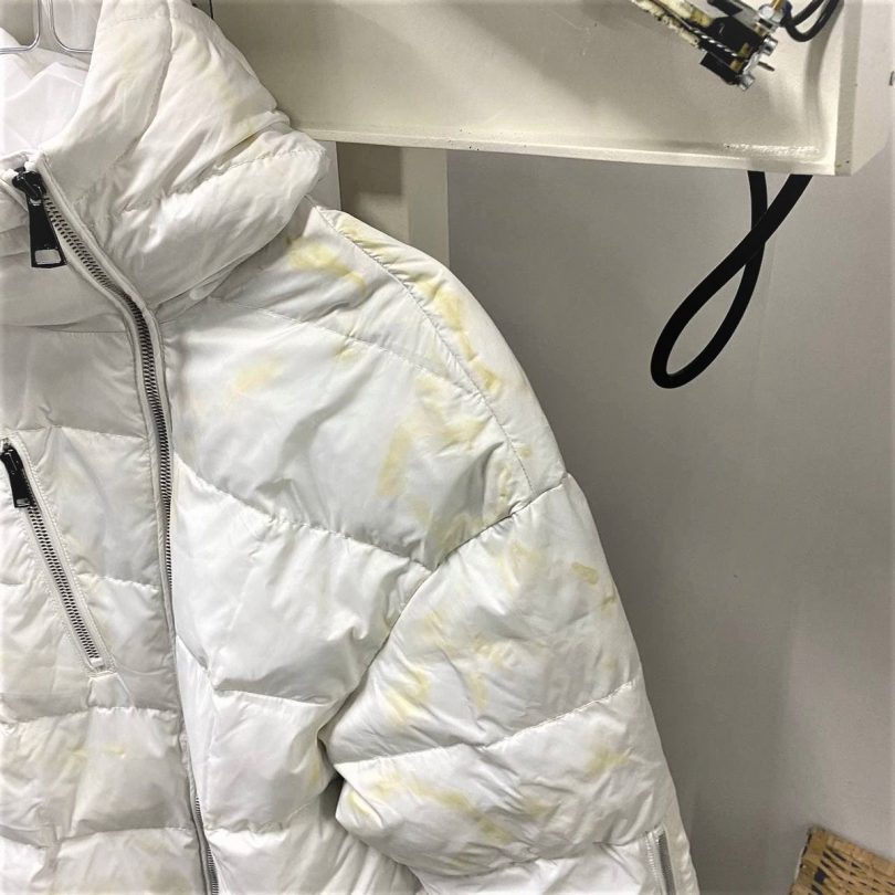 Иногда появление жирных пятен на пуховике – результат стирки в машине-автомат. В некоторых случаях при стирке в горячей воде пух может выделять жир под воздействием интенсивного тепла. Это и приводит к образованию на ткани желтоватых разводов. Как их убрать? Все просто: достаточно воспользоваться качественным пятновыводителем на основе кислорода.
