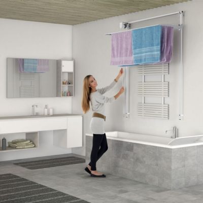 Нет больше спотыканий о неуклюжие отдельно стоящие воздуходувки или привязка стирки только для того, чтобы принести ее снова, когда начинается дождь. Просто загрузите стеллаж для белья, поднимите его к потолку и понеслось.